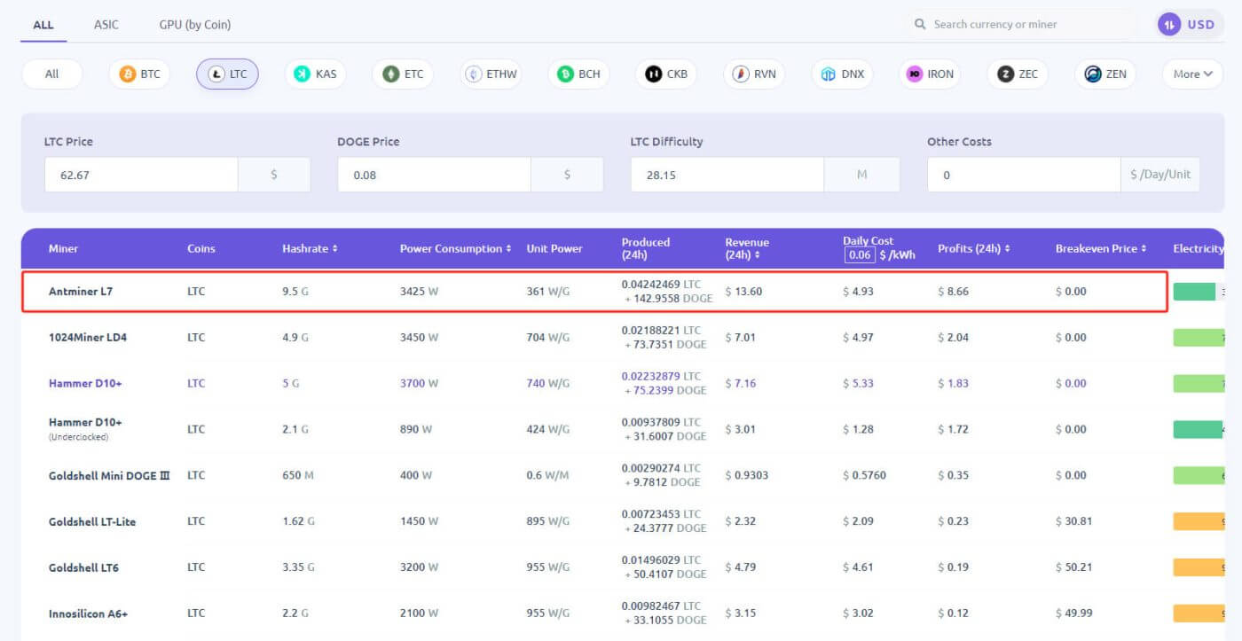 Litecoin is now trading at $61.99 and Dogecoin is trading at $0.07562 at the time this article was written. Based on these prices and the current mining difficulty of LTC and DOGE, the breaking threshold for electricity costs is $0.14 per kilowatt hour. In other words, the Bitmain Antminer L7 would currently be profitable if your electricity prices were $0.14 KWh or less.