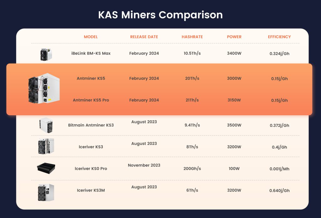 Now, let’s compare the KS5 with other leading Kaspa mining rigs in terms of hashrate and efficiency. Below is a quick comparison chart of top Kaspa miners for your reference.