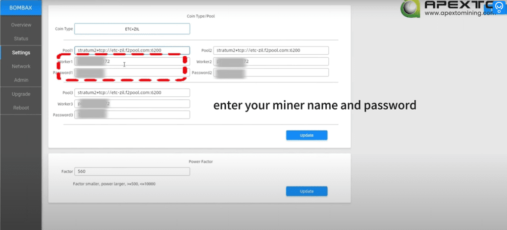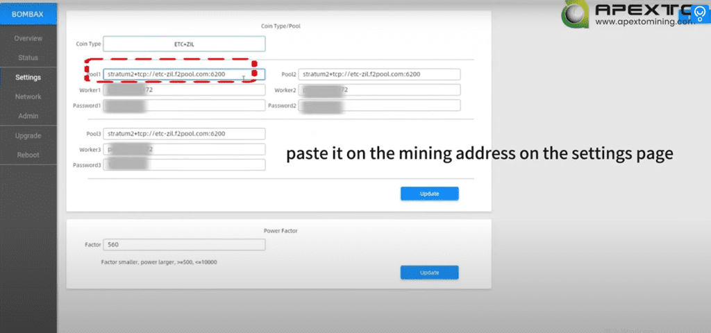 Now, go to the settings page and set up the mining pool, wallet address, and password.