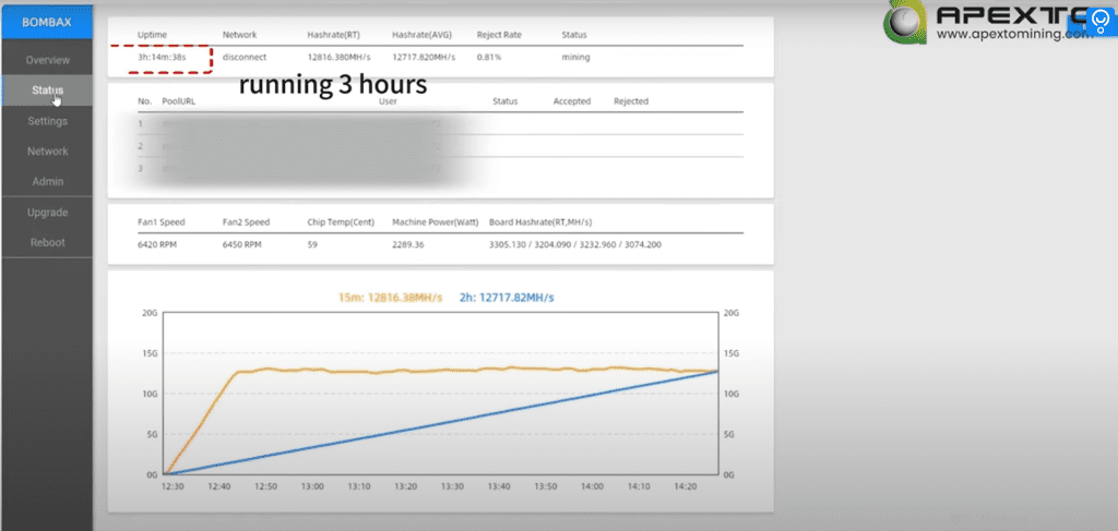 Now, check the ASIC’s dashboard. You can see the ASIC mining in its maximum hash rate.