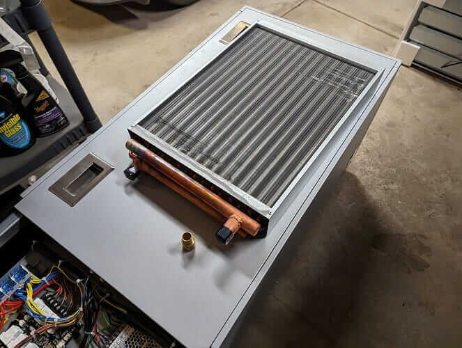 The exchager type I used for the furnace is this: https://www.freeheat4u.com/Water-to-Air-Heat-Exchanger–Import_c_37.html