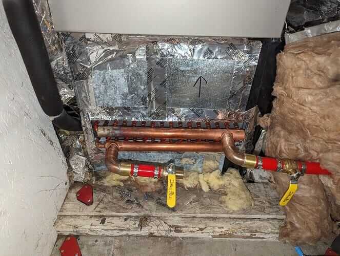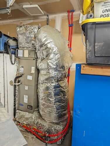 Heat exchanger placed on the output of the furnace air handler. While it may not be the absolute ideal place to put, this is what I eneded up doing based on the existing system there. The arrow does no indicate airflow direction.
