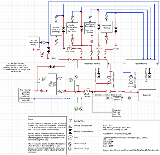 Disclaimer: I am by no means an experienced designer in hydronic systems. If you use any of this information then please use it at your own risk. This is also an evolving system that I will make changes to over the years. I have implemented some of what is in the drawing, but not everything yet.