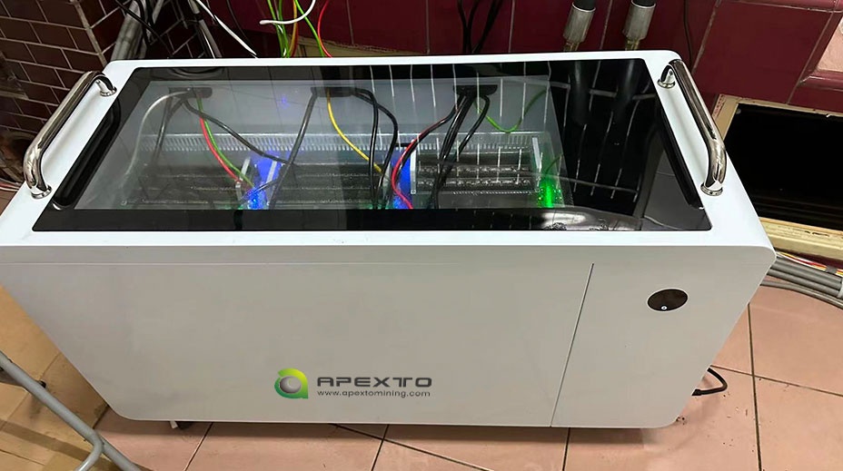 Six mining machines are operating normally inside the immersion cooling kit C6, while it is raining outside