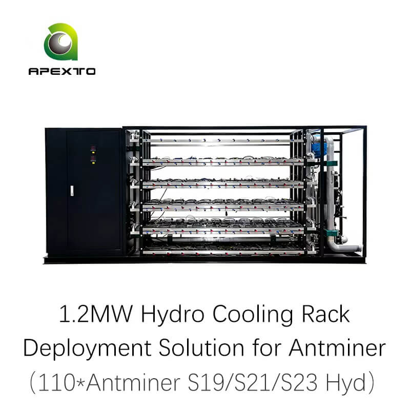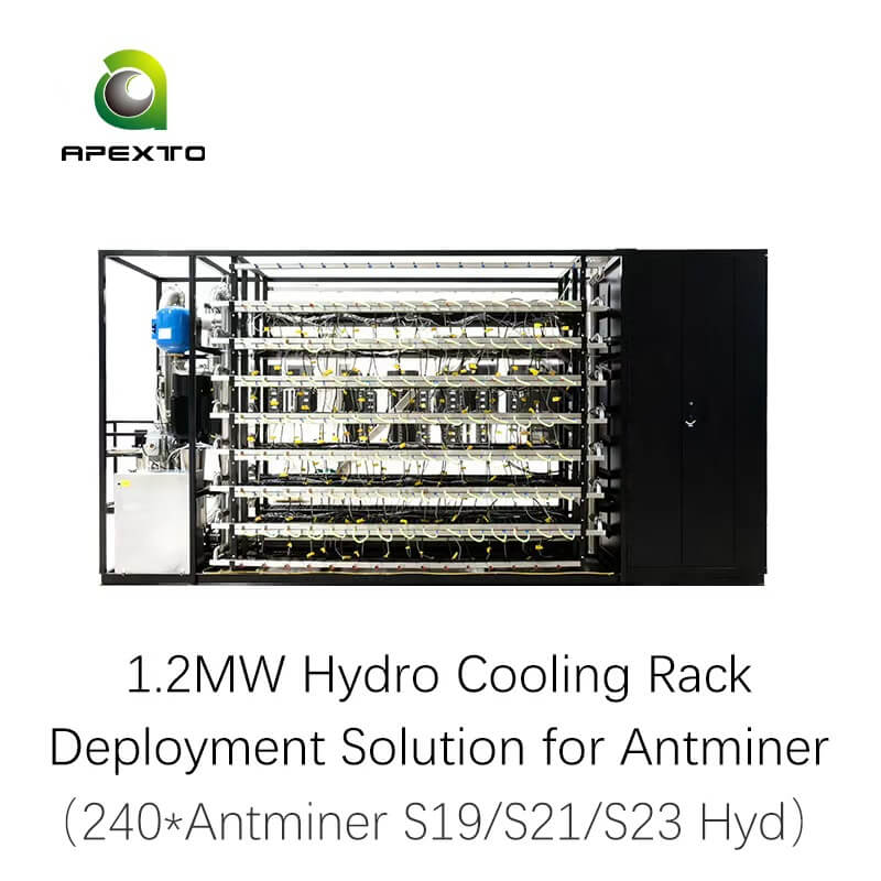 This 1.2MW hydro cooling rack deployment solution supports 240 Antminer S19/S21/S23 Hydro miners for stable hydro cooling operation in cryptocurrency mining setups.