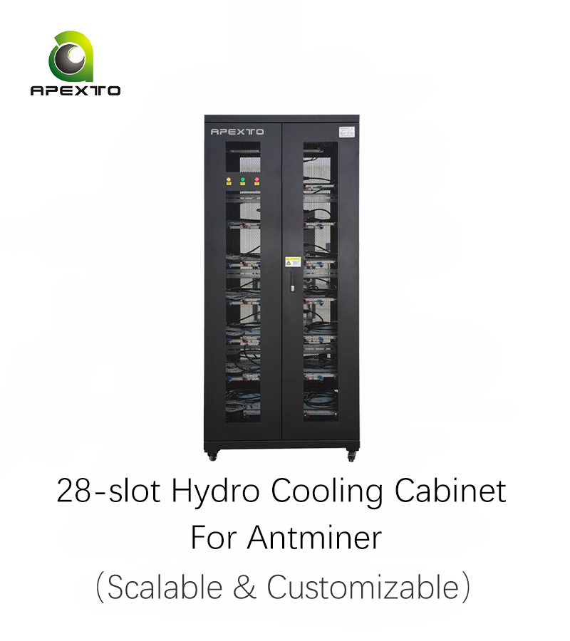 The 28-slot hydro cooling cabinet supports flexible scaling from kW-level setups to full MW-level Bitcoin and cryptocurrency mining deployments.