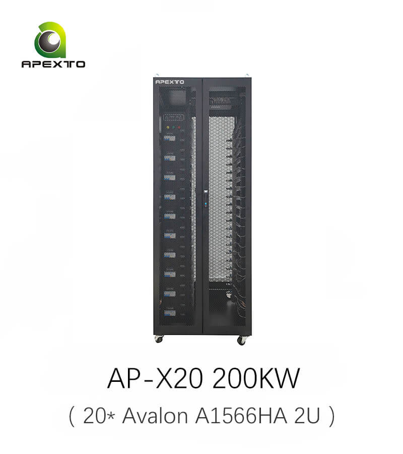 Avalon Hydro Cooling Cabinet AP-X20 supports 20 Avalon A1566HA 2U units, offering a scalable water cooling solution for Bitcoin mining.