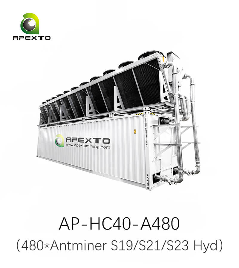 The AP-HC40-A480 is a 40ft hydro cooling container with 2.4MW capacity, designed to efficiently run 480 Antminer Hydro miners for large-scale Bitcoin mining operations.