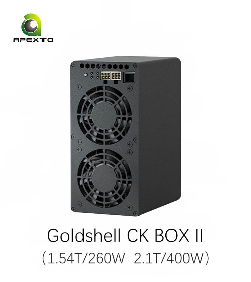 Model CK-BOX 2 from Goldshell mining 2 algorithms (Eaglesong) with a maximum hashrate of 2.1Th/s for a power consumption of 400W.